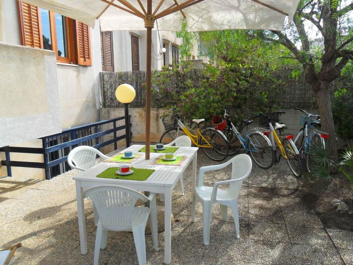 Dotata di ingresso singolo e di giardinetto recintato privato di circa 50 mq. con piante ornamentali mediterranee e attrezzato di ombrellone, tavolo, sedie e barbecue portatile, ideale per cene estive e serate di relax con amici.